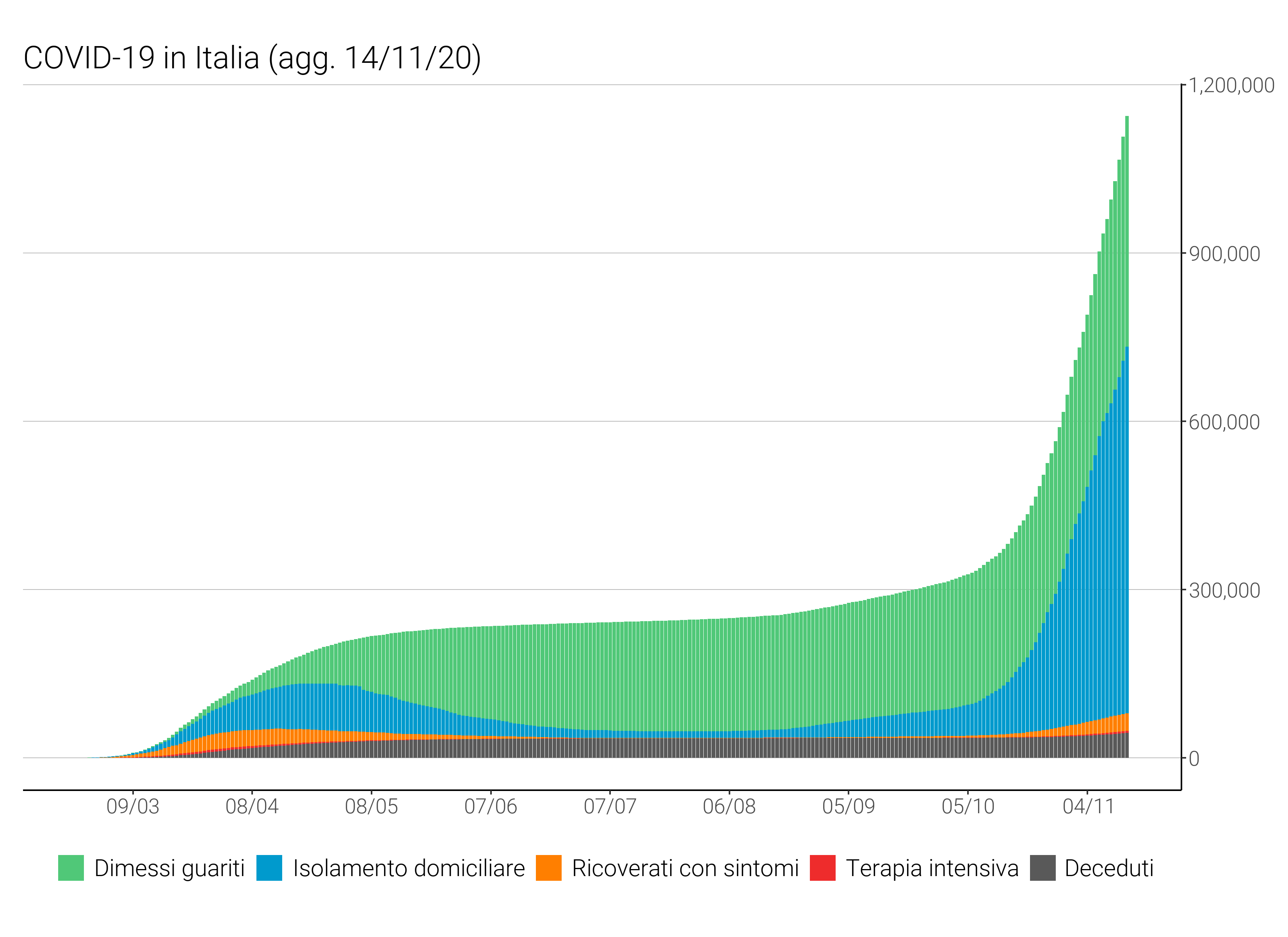 I grafici seguenti descrivono l'andamento dell'epidemia di COVID-19 in Italia. I dati di riferimento sono quelli rilasciati quotidianamente dalla Protezione Civile, che considera come casi confermati i soggetti su cui il test molecolare ha dato esito positivo. Poiché l'infezione non sempre produce sintomi, il numero reale di casi in Italia è sicuramente superiore a quanto riportato. Pertanto, il tasso di letalità effettivo del virus è certamente più basso rispetto a quanto appare da questi grafici.